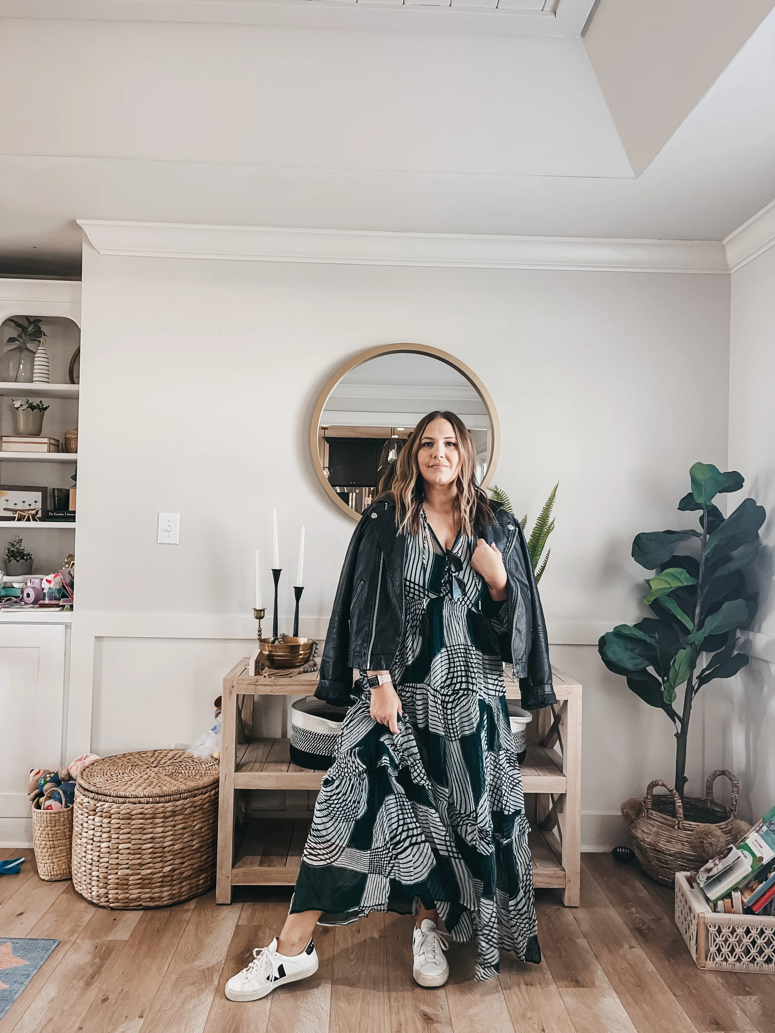 One of my favorite things in my closet to wear from the summer into the fall is dresses. Wearing in the summer with sandals is easy and a no brainer. To take them into the cooler months I love to swap the sandals for sneakers or booties and add a moto jacket for a layer of warmth and to complete the look.